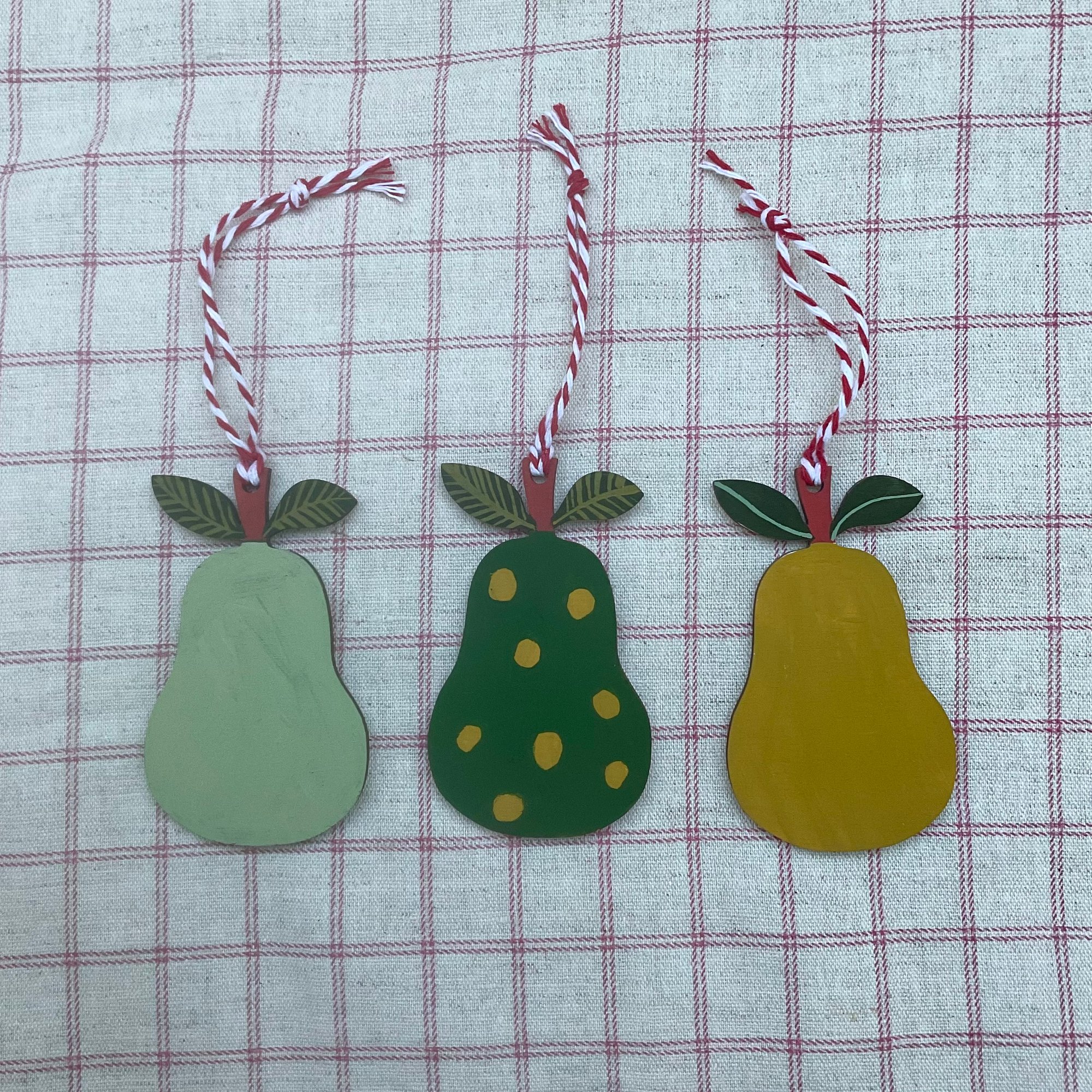 Handpainted on 4mm poplar ply and strung with stripy red bakers twine.