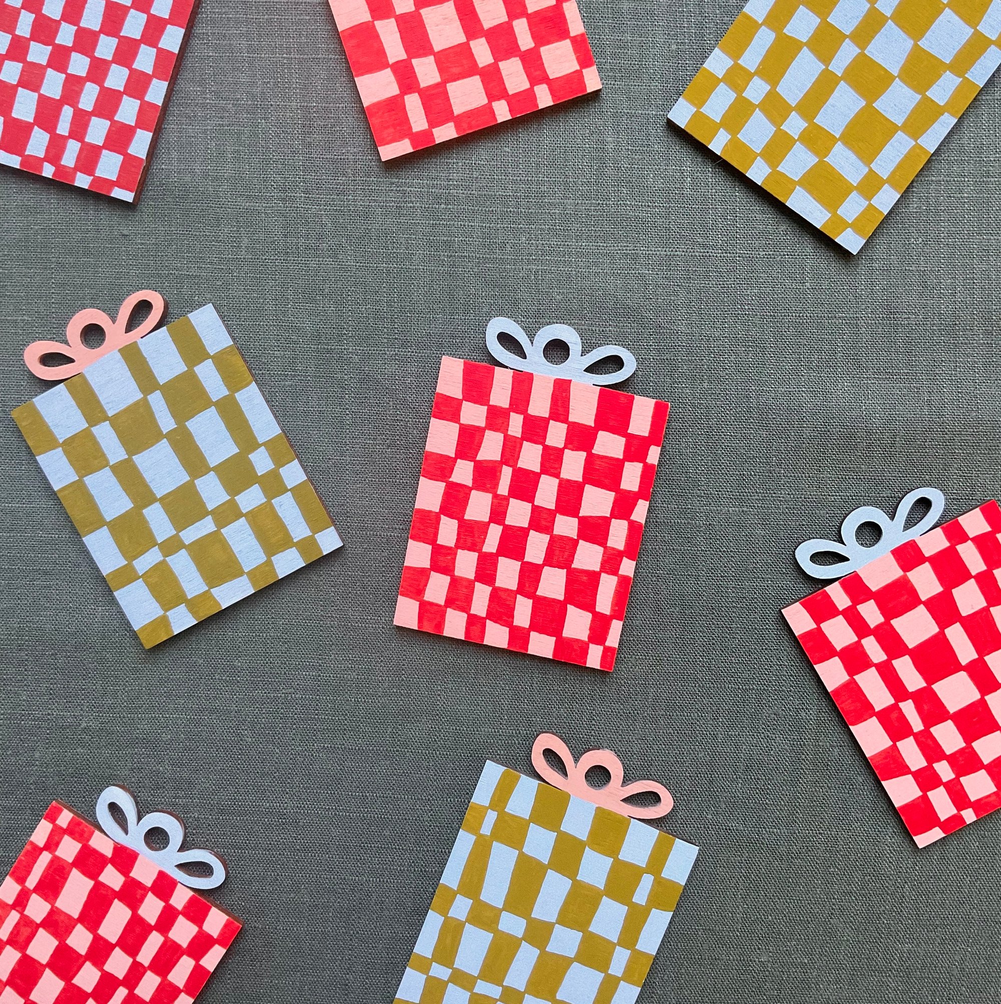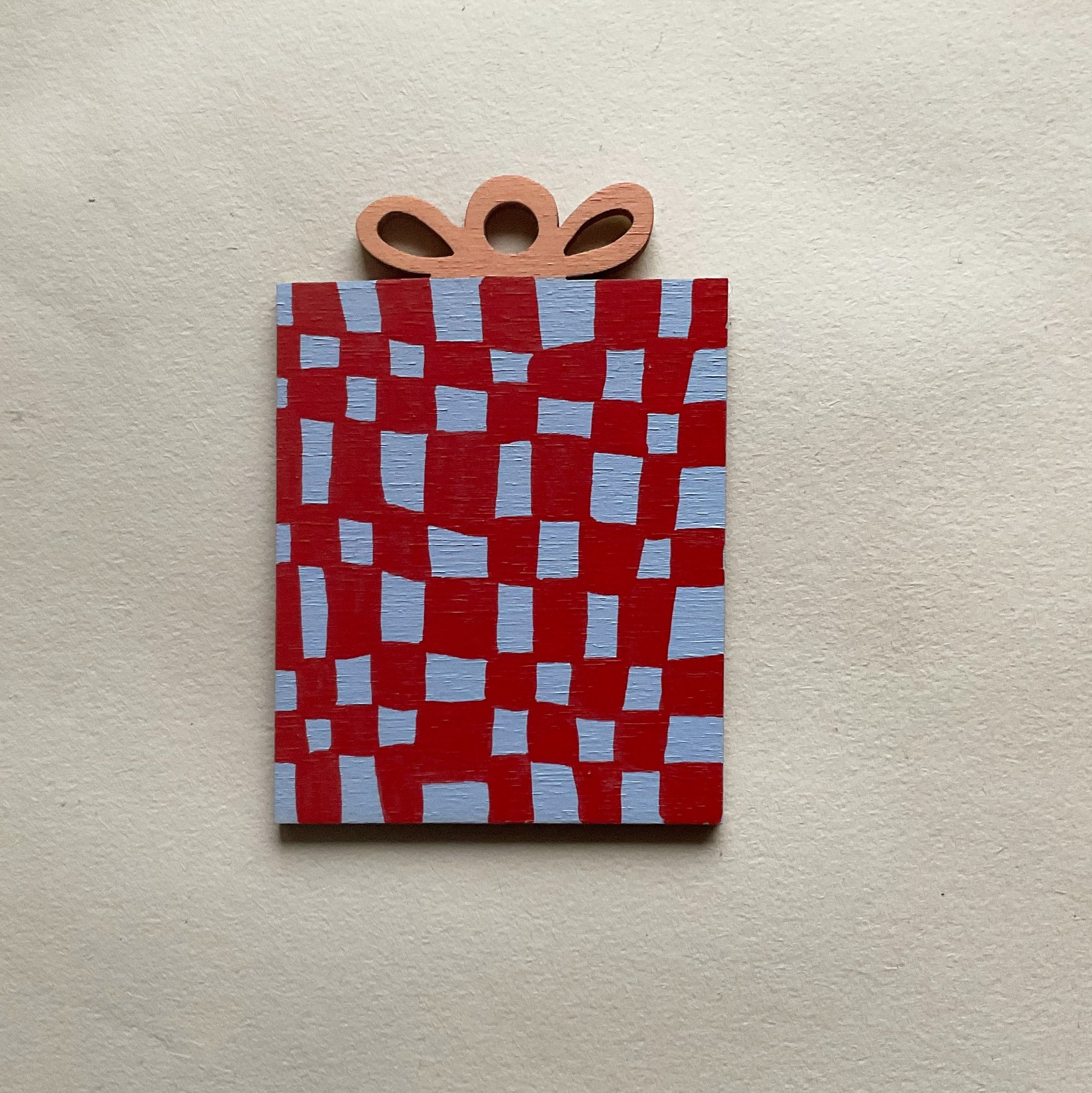 Handpainted on 4mm poplar ply and strung with red stripy bakers twine!